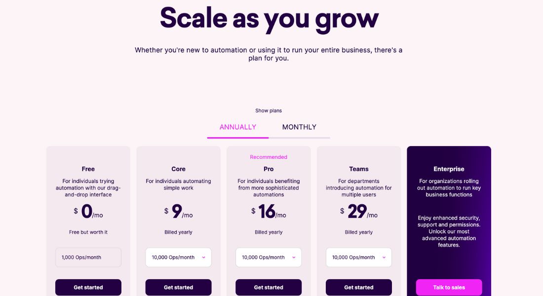 Free Version: Includes basic automation and a limited number of operations per month.